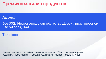 Премиум, магазин продуктов по адресу 606002, Нижегородская область, Дзержинск, проспект Свердлова, 14а в дальнейшем Организация, размещена в следующих категориях: