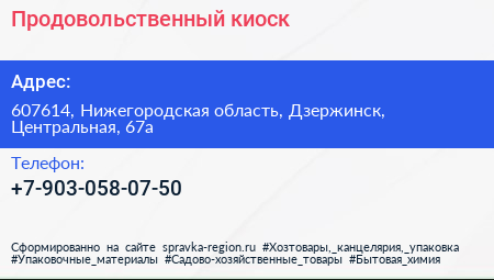 Продовольственный киоск по адресу 607614, Нижегородская область, Дзержинск, Центральная, 67а в дальнейшем Организация, размещена в следующих категориях: