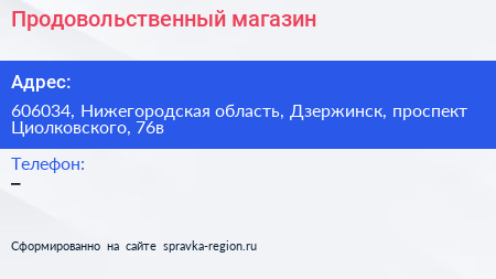 Продовольственный магазин по адресу 606034, Нижегородская область, Дзержинск, проспект Циолковского, 76в в дальнейшем Организация, размещена в следующих категориях: