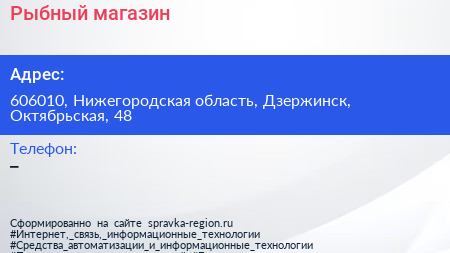 Рыбный магазин по адресу 606010, Нижегородская область, Дзержинск, Октябрьская, 48 в дальнейшем Организация, размещена в следующих категориях: