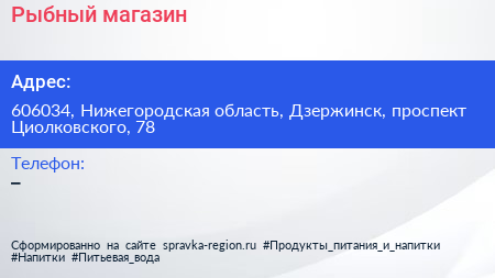 Рыбный магазин по адресу 606034, Нижегородская область, Дзержинск, проспект Циолковского, 78 в дальнейшем Организация, размещена в следующих категориях: