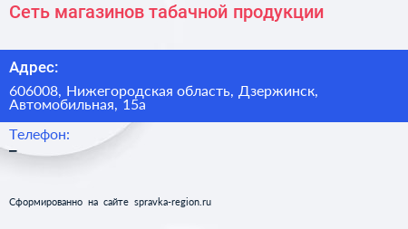 Сеть магазинов табачной продукции по адресу 606008, Нижегородская область, Дзержинск, Автомобильная, 15а в дальнейшем Организация, размещена в следующих категориях: