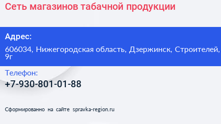 Сеть магазинов табачной продукции по адресу 606034, Нижегородская область, Дзержинск, Строителей, 9г в дальнейшем Организация, размещена в следующих категориях: