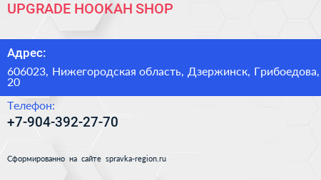 UPGRADE HOOKAH SHOP по адресу 606023, Нижегородская область, Дзержинск, Грибоедова, 20 в дальнейшем Организация, размещена в следующих категориях: