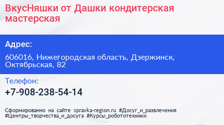 ВкусНяшки от Дашки, кондитерская мастерская по адресу 606016, Нижегородская область, Дзержинск, Октябрьская, 82 в дальнейшем Организация, размещена в следующих категориях: