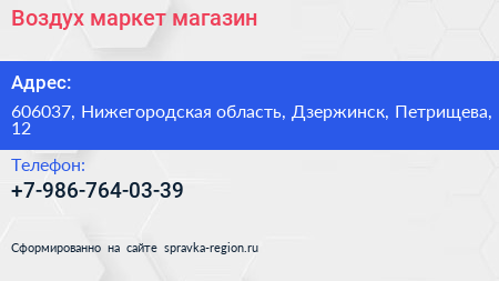 Воздух маркет, магазин по адресу 606037, Нижегородская область, Дзержинск, Петрищева, 12 в дальнейшем Организация, размещена в следующих категориях: