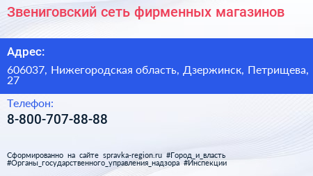 Звениговский, сеть фирменных магазинов по адресу 606037, Нижегородская область, Дзержинск, Петрищева, 27 в дальнейшем Организация, размещена в следующих категориях: