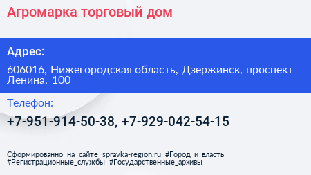 Агромарка, торговый дом по адресу 606016, Нижегородская область, Дзержинск, проспект Ленина, 100 в дальнейшем Организация, размещена в следующих категориях: