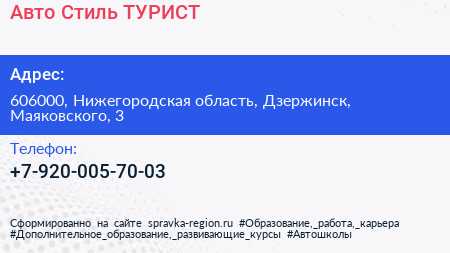 Авто Стиль ТУРИСТ по адресу 606000, Нижегородская область, Дзержинск, Маяковского, 3 в дальнейшем Организация, размещена в следующих категориях: