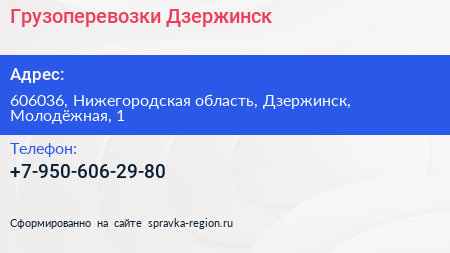 Грузоперевозки Дзержинск по адресу 606036, Нижегородская область, Дзержинск, Молодёжная, 1 в дальнейшем Организация, размещена в следующих категориях: