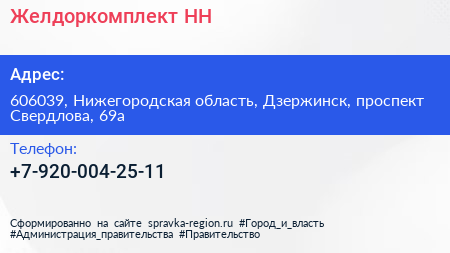 Желдоркомплект-НН по адресу 606039, Нижегородская область, Дзержинск, проспект Свердлова, 69а в дальнейшем Организация, размещена в следующих категориях: