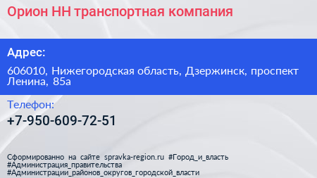 Орион-НН, транспортная компания по адресу 606010, Нижегородская область, Дзержинск, проспект Ленина, 85а в дальнейшем Организация, размещена в следующих категориях: