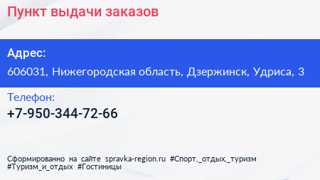 Пункт выдачи заказов по адресу 606031, Нижегородская область, Дзержинск, Удриса, 3 в дальнейшем Организация, размещена в следующих категориях: