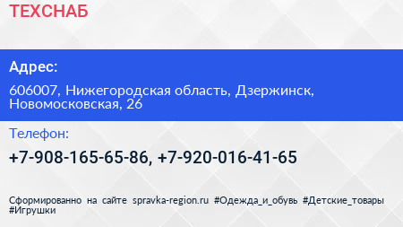 ТЕХСНАБ по адресу 606007, Нижегородская область, Дзержинск, Новомосковская, 26 в дальнейшем Организация, размещена в следующих категориях: