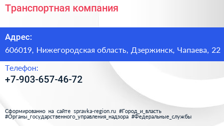 Транспортная компания по адресу 606019, Нижегородская область, Дзержинск, Чапаева, 22 в дальнейшем Организация, размещена в следующих категориях: