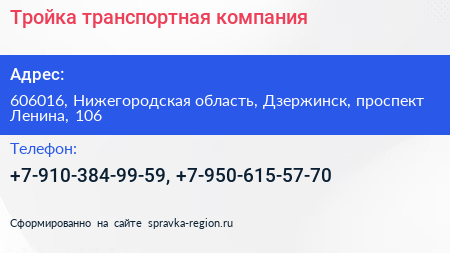 Тройка, транспортная компания по адресу 606016, Нижегородская область, Дзержинск, проспект Ленина, 106 в дальнейшем Организация, размещена в следующих категориях:
