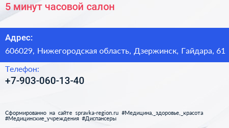 5 минут, часовой салон по адресу 606029, Нижегородская область, Дзержинск, Гайдара, 61 в дальнейшем Организация, размещена в следующих категориях: