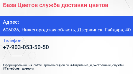 База Цветов, служба доставки цветов по адресу 606026, Нижегородская область, Дзержинск, Гайдара, 40 в дальнейшем Организация, размещена в следующих категориях: