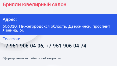 Брилли, ювелирный салон по адресу 606010, Нижегородская область, Дзержинск, проспект Ленина, 66 в дальнейшем Организация, размещена в следующих категориях: