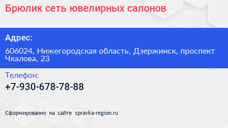 Брюлик, сеть ювелирных салонов по адресу 606024, Нижегородская область, Дзержинск, проспект Чкалова, 23 в дальнейшем Организация, размещена в следующих категориях:
