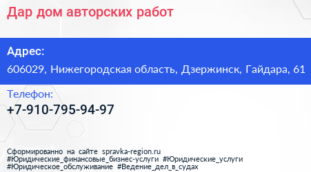 Дар, дом авторских работ по адресу 606029, Нижегородская область, Дзержинск, Гайдара, 61 в дальнейшем Организация, размещена в следующих категориях: