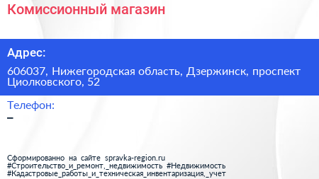 Комиссионный магазин по адресу 606037, Нижегородская область, Дзержинск, проспект Циолковского, 52 в дальнейшем Организация, размещена в следующих категориях: