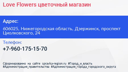 Love Flowers, цветочный магазин по адресу 606025, Нижегородская область, Дзержинск, проспект Циолковского, 24 в дальнейшем Организация, размещена в следующих категориях:
