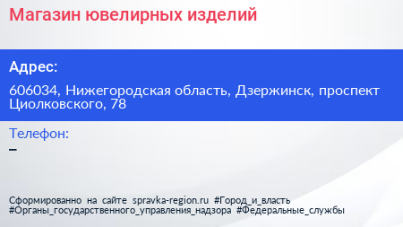 Магазин ювелирных изделий по адресу 606034, Нижегородская область, Дзержинск, проспект Циолковского, 78 в дальнейшем Организация, размещена в следующих категориях: