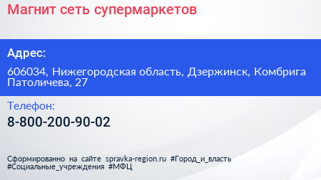 Магнит, сеть супермаркетов по адресу 606034, Нижегородская область, Дзержинск, Комбрига Патоличева, 27 в дальнейшем Организация, размещена в следующих категориях: