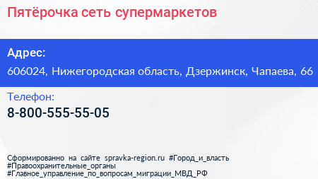 Пятёрочка, сеть супермаркетов по адресу 606024, Нижегородская область, Дзержинск, Чапаева, 66 в дальнейшем Организация, размещена в следующих категориях: