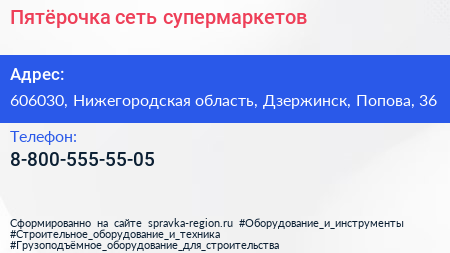 Пятёрочка, сеть супермаркетов по адресу 606030, Нижегородская область, Дзержинск, Попова, 36 в дальнейшем Организация, размещена в следующих категориях: