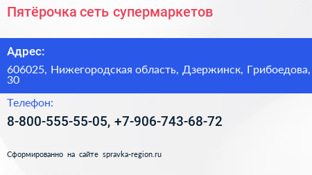 Пятёрочка, сеть супермаркетов по адресу 606025, Нижегородская область, Дзержинск, Грибоедова, 30 в дальнейшем Организация, размещена в следующих категориях: