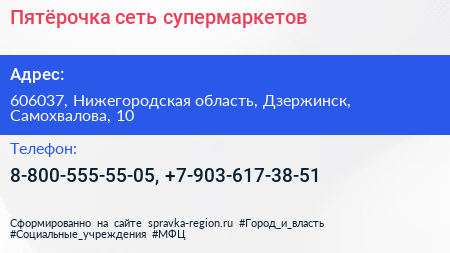 Пятёрочка, сеть супермаркетов по адресу 606037, Нижегородская область, Дзержинск, Самохвалова, 10 в дальнейшем Организация, размещена в следующих категориях: