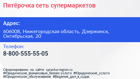 Пятёрочка, сеть супермаркетов по адресу 606008, Нижегородская область, Дзержинск, Октябрьская, 20 в дальнейшем Организация, размещена в следующих категориях: