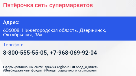Пятёрочка, сеть супермаркетов по адресу 606008, Нижегородская область, Дзержинск, Октябрьская, 36а в дальнейшем Организация, размещена в следующих категориях: