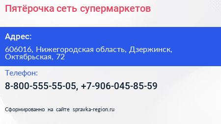 Пятёрочка, сеть супермаркетов по адресу 606016, Нижегородская область, Дзержинск, Октябрьская, 72 в дальнейшем Организация, размещена в следующих категориях: