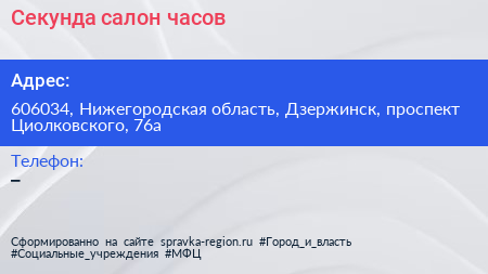 Секунда, салон часов по адресу 606034, Нижегородская область, Дзержинск, проспект Циолковского, 76а в дальнейшем Организация, размещена в следующих категориях: