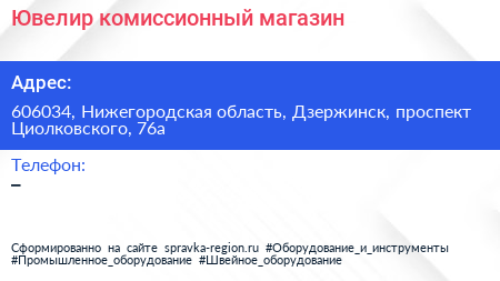Ювелир, комиссионный магазин по адресу 606034, Нижегородская область, Дзержинск, проспект Циолковского, 76а в дальнейшем Организация, размещена в следующих категориях: