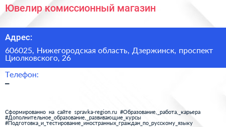 Ювелир, комиссионный магазин по адресу 606025, Нижегородская область, Дзержинск, проспект Циолковского, 26 в дальнейшем Организация, размещена в следующих категориях: