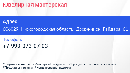 Ювелирная мастерская по адресу 606029, Нижегородская область, Дзержинск, Гайдара, 61 в дальнейшем Организация, размещена в следующих категориях: