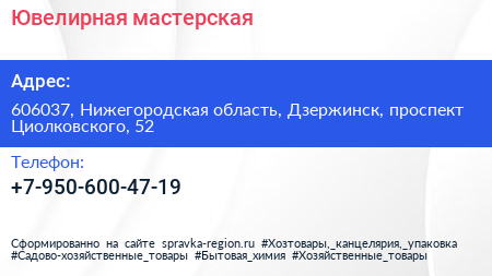 Ювелирная мастерская по адресу 606037, Нижегородская область, Дзержинск, проспект Циолковского, 52 в дальнейшем Организация, размещена в следующих категориях: