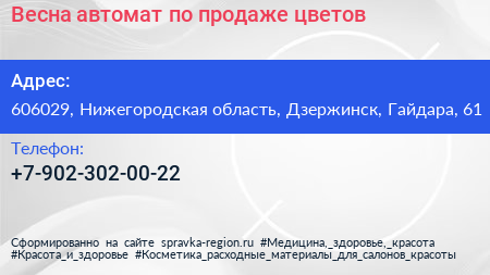 Весна, автомат по продаже цветов по адресу 606029, Нижегородская область, Дзержинск, Гайдара, 61 в дальнейшем Организация, размещена в следующих категориях: