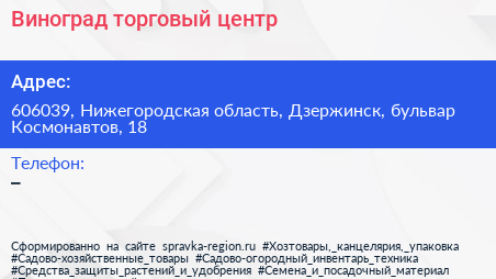 Виноград, торговый центр по адресу 606039, Нижегородская область, Дзержинск, бульвар Космонавтов, 18 в дальнейшем Организация, размещена в следующих категориях: