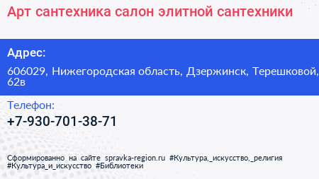 Арт сантехника, салон элитной сантехники по адресу 606029, Нижегородская область, Дзержинск, Терешковой, 62в в дальнейшем Организация, размещена в следующих категориях: