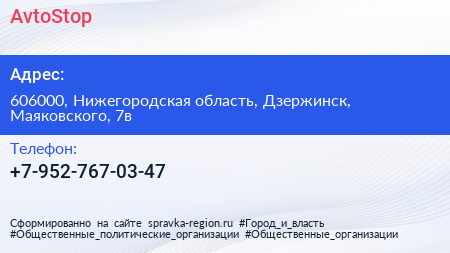 AvtoStop по адресу 606000, Нижегородская область, Дзержинск, Маяковского, 7в в дальнейшем Организация, размещена в следующих категориях: