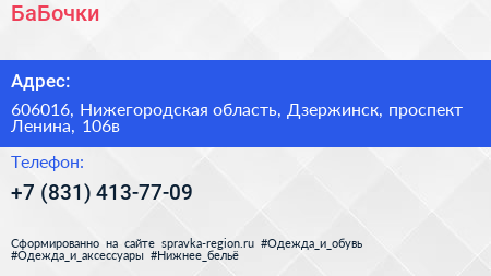 БаБочки по адресу 606016, Нижегородская область, Дзержинск, проспект Ленина, 106в в дальнейшем Организация, размещена в следующих категориях: