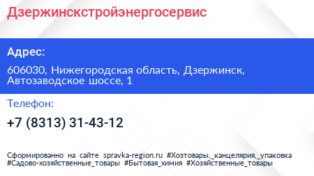 Дзержинскстройэнергосервис по адресу 606030, Нижегородская область, Дзержинск, Автозаводское шоссе, 1 в дальнейшем Организация, размещена в следующих категориях: