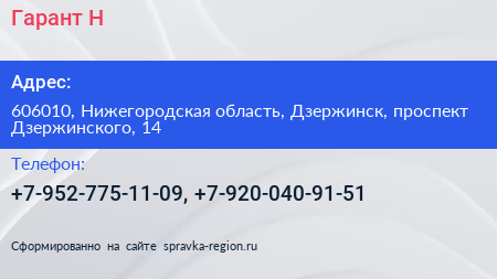 Гарант-Н по адресу 606010, Нижегородская область, Дзержинск, проспект Дзержинского, 14 в дальнейшем Организация, размещена в следующих категориях: