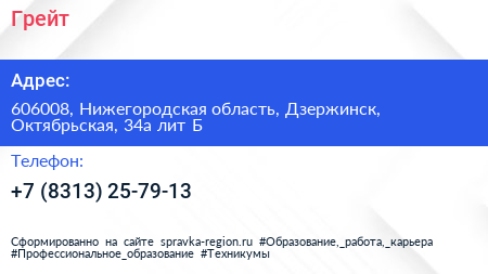 Грейт по адресу 606008, Нижегородская область, Дзержинск, Октябрьская, 34а лит Б в дальнейшем Организация, размещена в следующих категориях:
