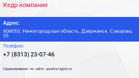 Кедр, компания по адресу 606010, Нижегородская область, Дзержинск, Суворова, 35 в дальнейшем Организация, размещена в следующих категориях: